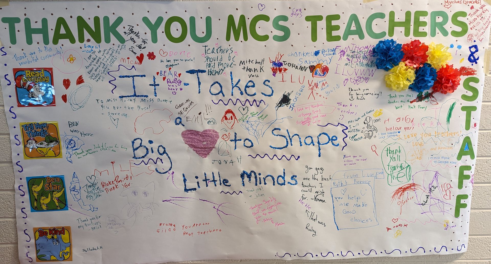 For Teacher Appreciation Week, we honored our teachers with flowers, snacks, sentiments, donuts and bagels, lunch and gift cards. Our Parent School Alliance organized the teacher recognition involving many parents for provisions, setup and delivery, and involved the Montessori Education Foundation to provide a catered lunch.